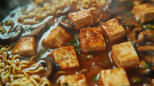 Close-up of Spicy Ramen with Chili Paste Tofu Cubes