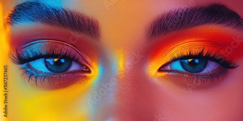 Close-up of striking eye makeup showcasing bright colors and intricate details. The model's eyes reflect vivid hues, emphasizing artistry and creativity