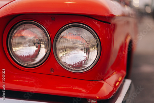 Close-up of the front of the red vintage car. Color detail on the headlight