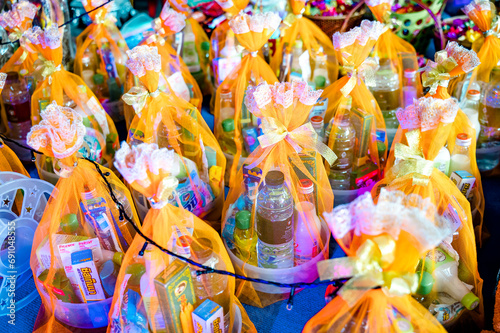 Close-up of the Give the offering dedicated to the monks set, an orange ribbon on top of the altar to make merit in Buddhism, a tradition of belief in Thailand, a set of offerings dedicated to the mon