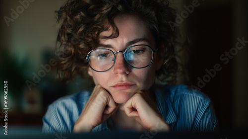 Close-up of thoughtful young woman with curly hair and glasses looking at laptop screen late at night
