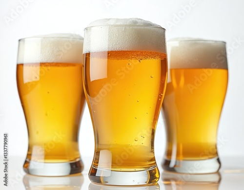 Close-up of three glasses beer with white foam on transparent table. Golden lager drink with bubbles suitable for summer, beer festival, pub advertising. Refreshment beverage.
