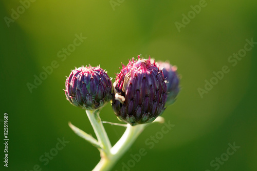 Close-up of three vibrant purple flower buds. Shallow depth of field highlights the detail.