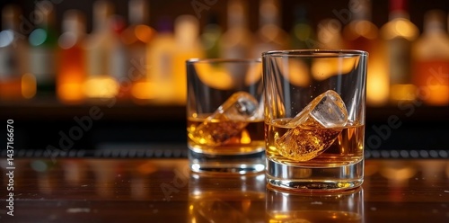 Close-up of two crystal whiskey glasses on polished bar, elegant, drinkware, relax