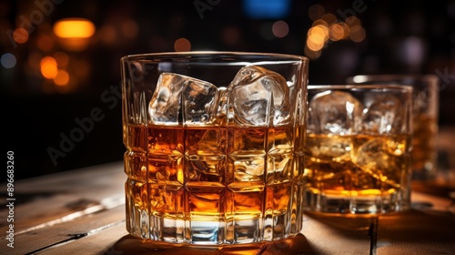 Close-up of two glasses of whiskey with ice cubes on a wooden table in a dimly lit bar setting. Perfect for beverage and lifestyle themes.