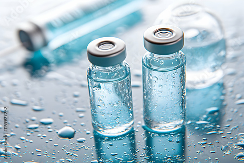 Close-up of two vials filled with a clear, light blue liquid, sitting on a wet, reflective surface. Water droplets adorn the vials and surface.