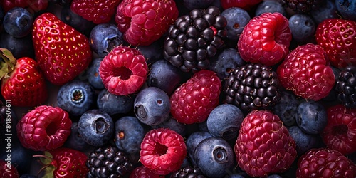 Close-up of various fresh berries with water droplets, including strawberries, blueberries, raspberries, and blackberries.