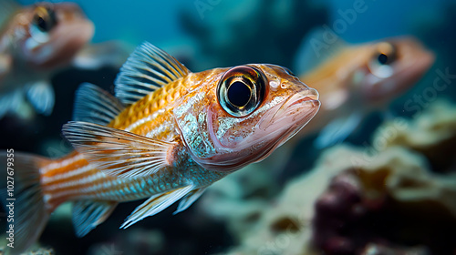 Close-up of vibrant fish swimming underwater.