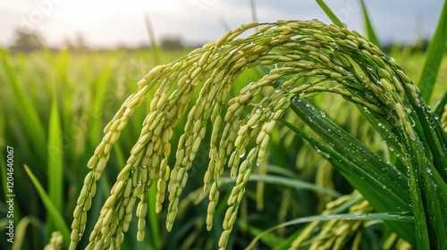 Close-Up of Vibrant Green Rice Plant with Dew Drops in Sunlight, Showcasing the Richness of Agriculture and Natural Beauty in a Fertile Field Landscape