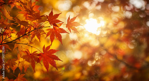 Closeup of vibrant orange maple leaves illuminated by sunlight