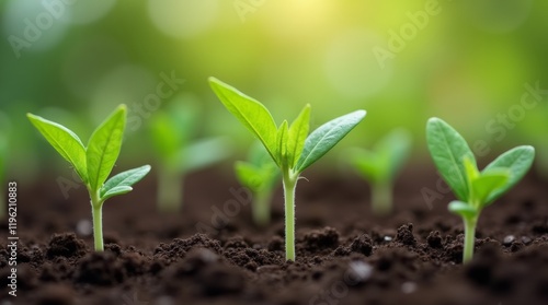 Close-up of vibrant tomato seedlings sprouting in rich, dark soil.
