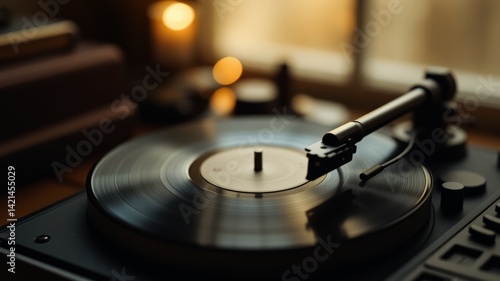 Close-Up of Vintage Turntable with Illuminated Background and Vinyl Record Spinning Quietly