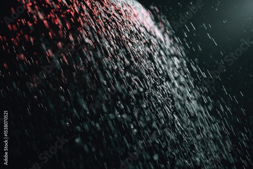 Close-up of water droplets falling against a dark background, illuminated with red and white light, creating a dynamic, textured visual