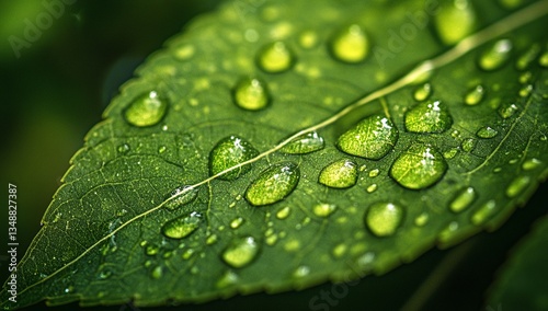 Close-up of water droplets on a vibrant green leaf, showcasing the beauty of nature's details.