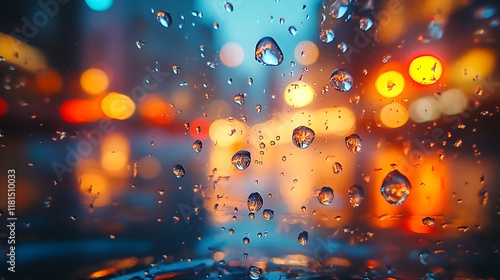 Closeup of water droplets on glass with blurred city lights in the background creating a calming and dynamic aesthetic