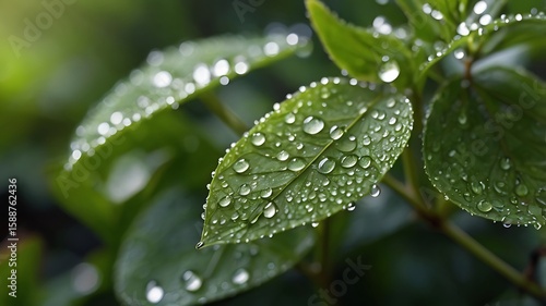 Close-up of water droplets on green leaves after rain with bokeh background
