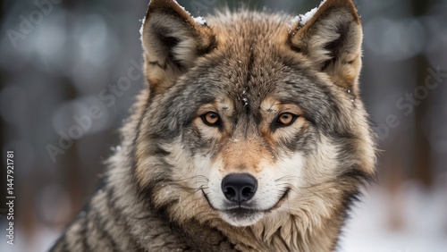 "Close-Up of Wild Grey Wolf with Snow-Dusted Muzzle in Winter Forest"