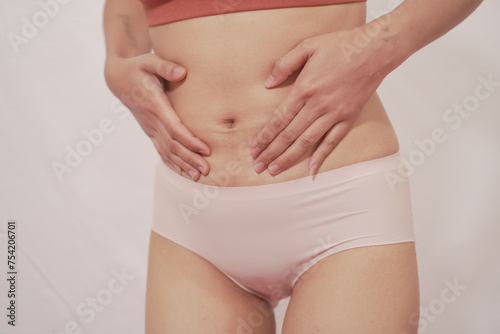 Close-up of woman wearing white panties On a white background about menstruation, cervical cancer, ovarian cancer.
