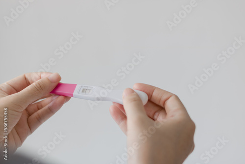 Close-up of young woman hand holding pregnancy test on white background. back view of a happy smiling woman looking at a pregnancy test with a positive result.