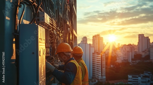 Close-up on technicians working on electrical installations on bright cityscape in the background with warm afternoon light