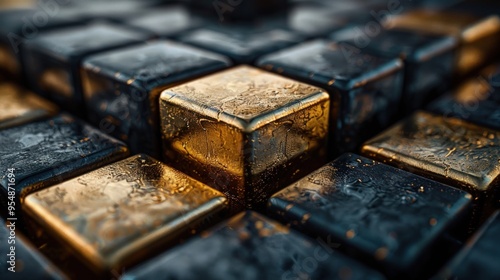Close-up photo of a grid of black and gold cubes with a metallic and shiny finish.