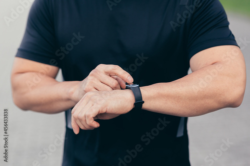 Close-up photo of a male athlete choosing a sports program on a fitness bracelet
