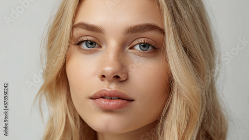 Close-up photo of beautiful blonde model with shiny perfect skin. Beauty makeup commercial cover