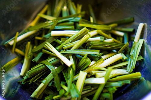 Close-up photo of Chinese chives on a food bowl, a condiment for preparing Pad Thai in the kitchen.