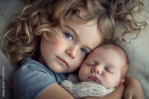 Close-up photograph of a girl of about 8 years old hugging her little brother. concept of tenderness, of love. family affection