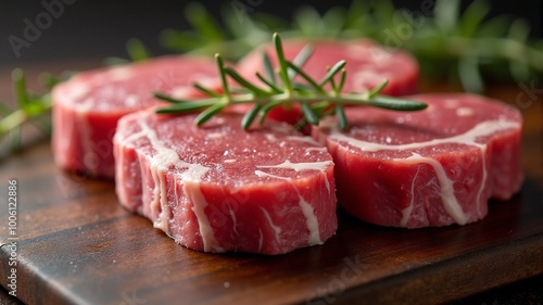 closeup pieces of meat laid out on a chopping board along with a green sprig of rosemary