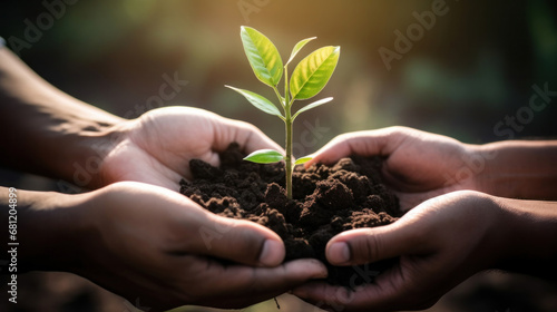 Close-up Plant in hands of business people for teamwork, support or environment Collaborating, growing, and investing in people and the soil for the future.