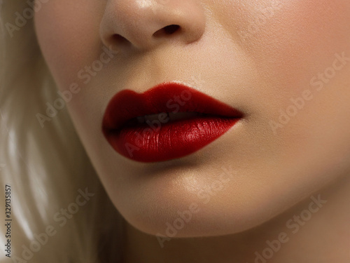 Closeup plump Lips. Lip Care, Augmentation, Fillers. Macro photo with Face detail. Natural shape with perfect contour. Close-up perfect lip makeup beautiful female mouth. Plump sexy full red lips
