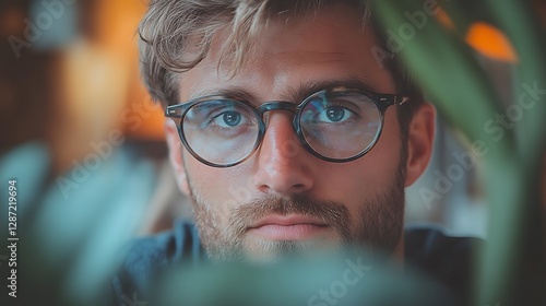 Close-up Portrait, Man, Cafe, Green Plant