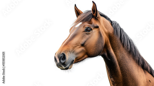 Close-up portrait of a brown horse isolated on a white background.