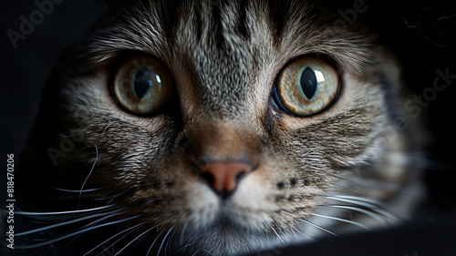 Close-Up Portrait of a Cute Gray Cat with Green Eyes and Whiskers