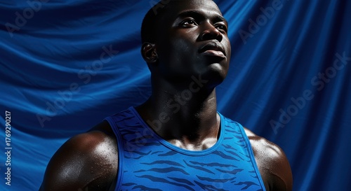 Close-up portrait of a determined Black athlete looking up against a dramatic dark blue background