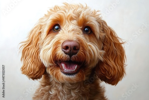 close-up portrait of a happy curly-haired golden dog with big dark eyes and an open mouth showing teeth against a neutral background