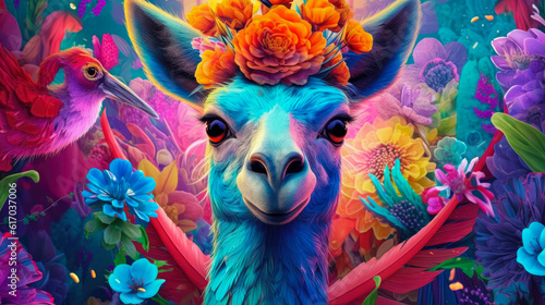 Close-up portrait of a Ilama with colorful vibes. Wildlife animals.
