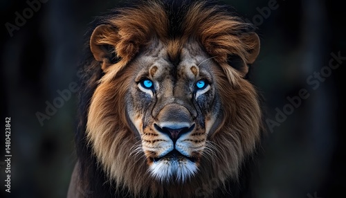 Close-up portrait of a majestic lion with luminous blue eyes.