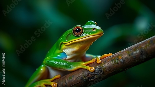 Close-up portrait of a vibrant green tree frog in its lush rainforest habitat.