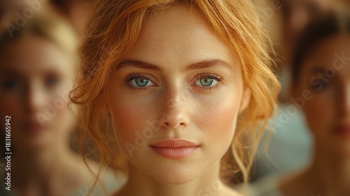 Close-up portrait of a woman with delicate freckles and a serene expression. Captures natural beauty and a gentle demeanor. Ideal for representing authenticity and tranquility.