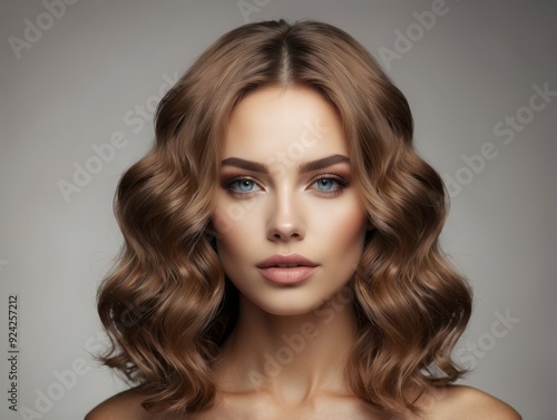 Close-up Portrait of a Woman with Long Brown Wavy Hair and Blue Eyes