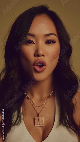 Close-up portrait of a young Asian woman with long dark hair, wearing a white top and necklaces, making a surprised or expressive face.