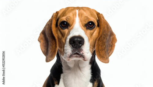 Close-up portrait of Beagle dog isolated on white background in high resolution for pet photography, animal portraits, and pet care design projects