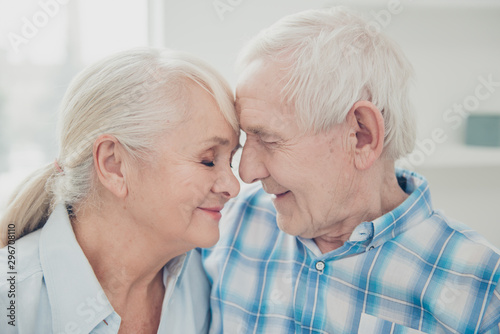 Close-up portrait of her she his he two nice attractive lovely kind sweet gentle cheerful peaceful calm affectionate spouses cuddling in light white interior living-room indoors