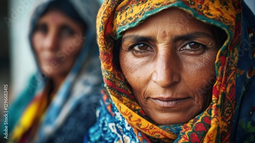 Close-up portrait of two women in colorful headscarves, showcasing cultural attire and expressions