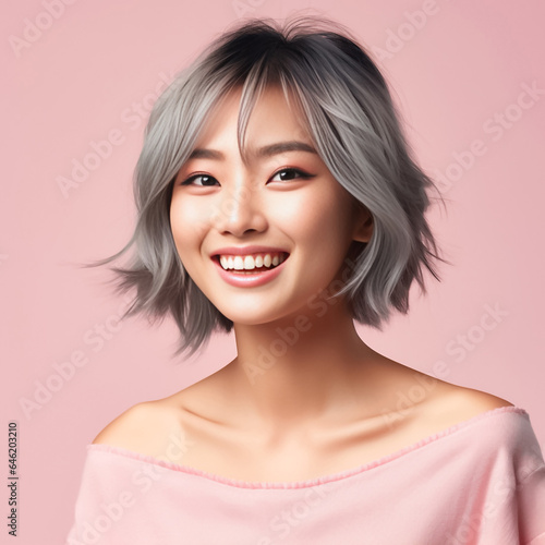Close-up portrait of woman nice attractive lovely pretty cheerful cheery glad wavy-haired girl folded arms isolated over nude pastel color background. Generative AI.