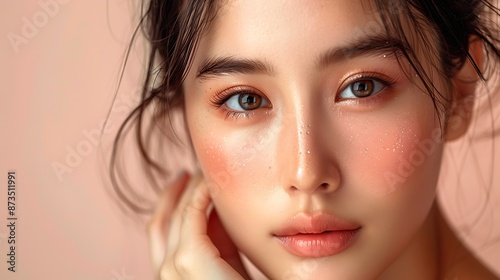 Close-up portrait of young Asian beautiful woman with K-beauty make up style and healthy and perfect skin isolated on beige background for skincare commercial product advertising.