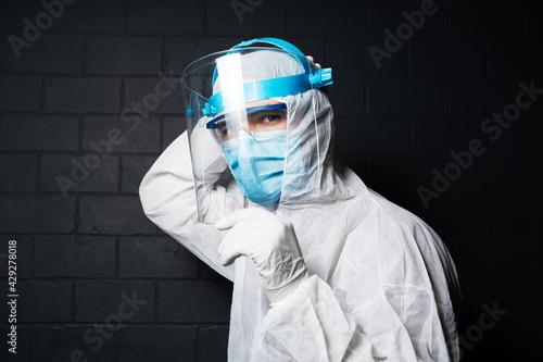 Close-up portrait of young doctor man wearing PPE suit against coronavirus and covid-19. Background of black brick wall. Holding safety face shield with hands.