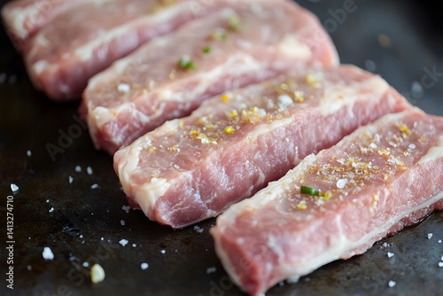 Closeup Raw Marinated Pork Chops Ready for Grilling